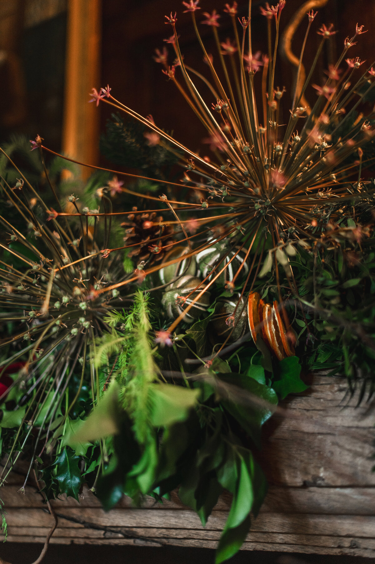 From the traditional moss base and fragrant evergreen foliage to carefully selected seasonal details, such as dried fruits, seed heads, and velvet ribbons, every element is thoughtfully chosen.